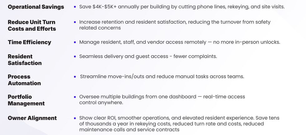 Reduce fob and key costs, minimize truck rolls, and cut down on resident complaints. Enjoy measurable savings and a smoother experience for both staff and residents.