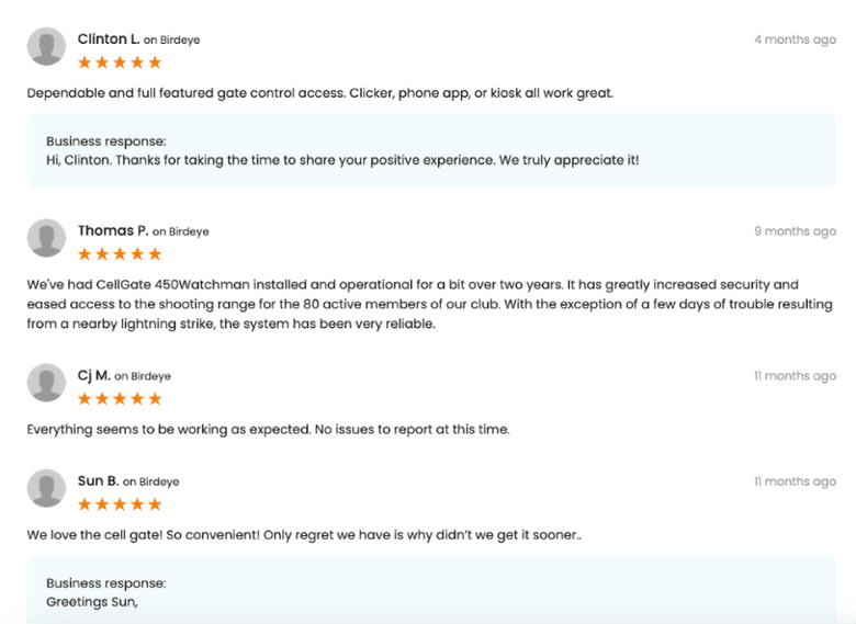 According to Birdeye reviews, CellGate receives primarily positive feedback, boasting a 4.9/5 rating from 199 reviews. Users have appreciated the easy setup and remote accessibility, particularly highlighting the convenience of managing security from anywhere—many praise customer service for being helpful and responsive, especially during installation and troubleshooting.