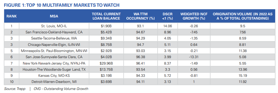 - St. Louis: Approximately 14% of the multifamily properties in St. Louis had a DSCR of less than 1x, the highest percentage among the 50 largest MSAs. The occupancy level in this area was also one of the lowest compared to other MSAs, with a 93% WA TTM occupancy rate.