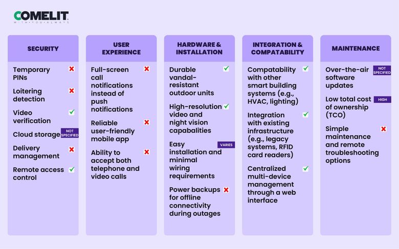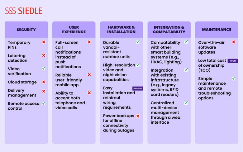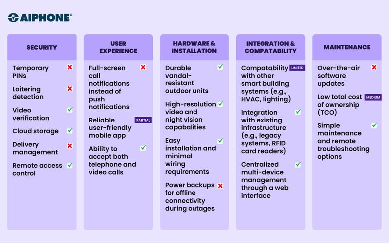 - Cons: Limited access control, security concerns with door relays, one-way video only, no built-in SIP or PBX, not ADA-compliant.