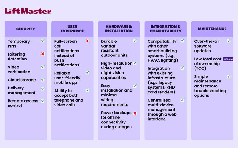 - Cons: Limited to LiftMaster ecosystem, lacks SIP/WebRTC connectivity, must be connected to the internet to receive calls.